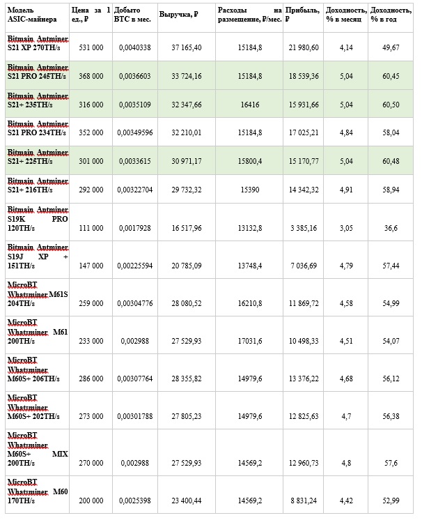 Стоимость хостинга в дата-центрах Intelion в августе составляла от 13 132,8 до 31 600,8 рублей за единицу оборудования в зависимости от модели. При таких параметрах диапазон добычи составил 0,0017928–0,00651384 BTC в месяц. Все устройства сохранили положительную доходность в пределах 3–5 % в месяц или 36–60 % годовых, что остается выше показателей большинства традиционных инвестиционных инструментов.