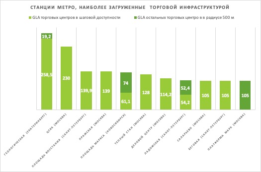 Обычно рядом с ТПУ стоят один или два торговых центра, но вокруг некоторых станций группируются сразу по три здания. Среди них «Коньково», «Митино», «Проспект Вернадского», «Электрозаводская», «Юго-Западная». Если расширить радиус со 150 до 500 м, к этому списку присоединятся станции «Бабушкинская», «Балтийская», «Бульвар Дмитрия Донского», «Коломенская», «Кузьминки», «Новые Черёмушки» и «Щёлковская». Особенное значение для торговой индустрии на западе Москвы имеет станция «Крылатское». В границах ее 500-метровой зоны действуют четыре ТЦ – «Западный», «Крылатский», «РТС Рублевский» и Zar, которые суммарно содержат 36,5 тыс. кв. м арендопригодной площади. Это далеко не самая высокая концентрация ритейла возле ТПУ. Максимум зафиксирован у станции «ЦСКА», которая обслуживает гигантский поток покупателей, направляющихся в ТРК «Авиапарк» (GLA 230 тыс. кв. м). Вдвое меньшая нагрузка ложится на станции «Пражская» (GLA 139 тыс. кв. м, ТРК Columbus и небольшой ТЦ «Пражский Град») и «Тёплый стан» (GLA 128 тыс. кв. м, ТЦ «Спектр» и ТЦ «Принц Плаза»). 100+ тыс. кв. м арендного предложения скопилось также вблизи станций «Деловой центр» (GLA 114,2 тыс. кв. м, ТРК «Афимолл Сити»), «Саларьево» (GLA 105 тыс. кв. м, ТРК «Саларис») и платформы МЦД-1 «Марк» (GLA 105 тыс. кв. м, ТРЦ «Рио»).